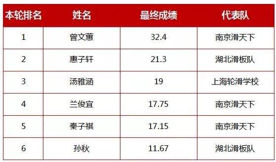▲2019全国滑板锦标赛女子街式决赛排名情况